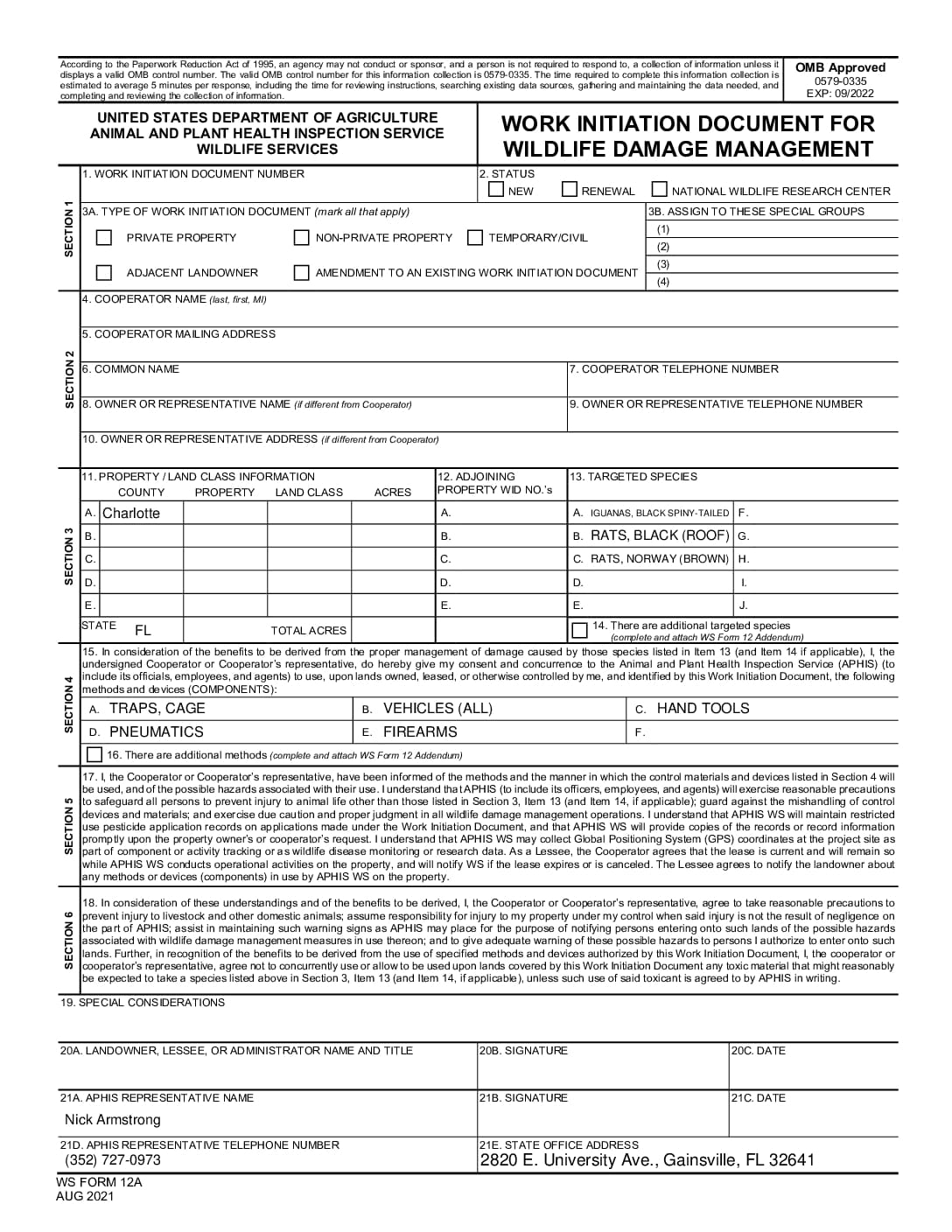 - Block E – Firearms = This is a means of dispatching iguanas that are outside of the traps. The rifle used is a 22-caliber rifle shooting a snake shot. The average range is approximately 10-15 yds.
