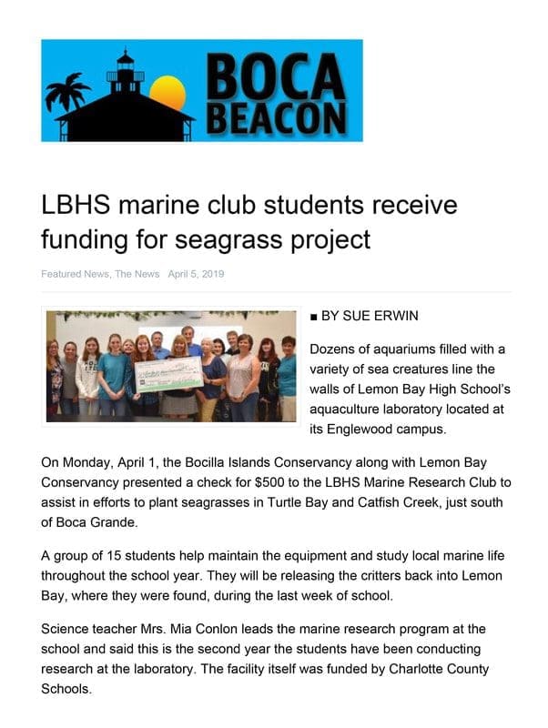 At the May 13, 2019 PIE Board meeting, the Directors voted to make a $500 donation to the Lemon Bay High School Marine Research Club to support their sea grass planting project. Sue Erwin of the BOCA BEACON wrote a terrific article about the program back in April, when the Bocilla Islands Conservancy and Lemon Bay Conservancy donated to the program. We have reproduced the article below.